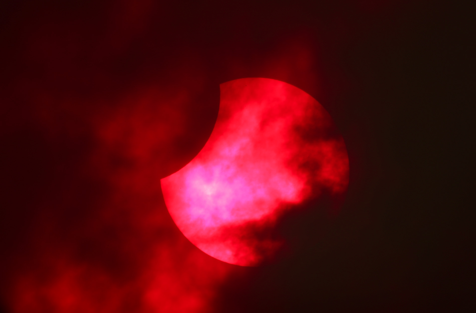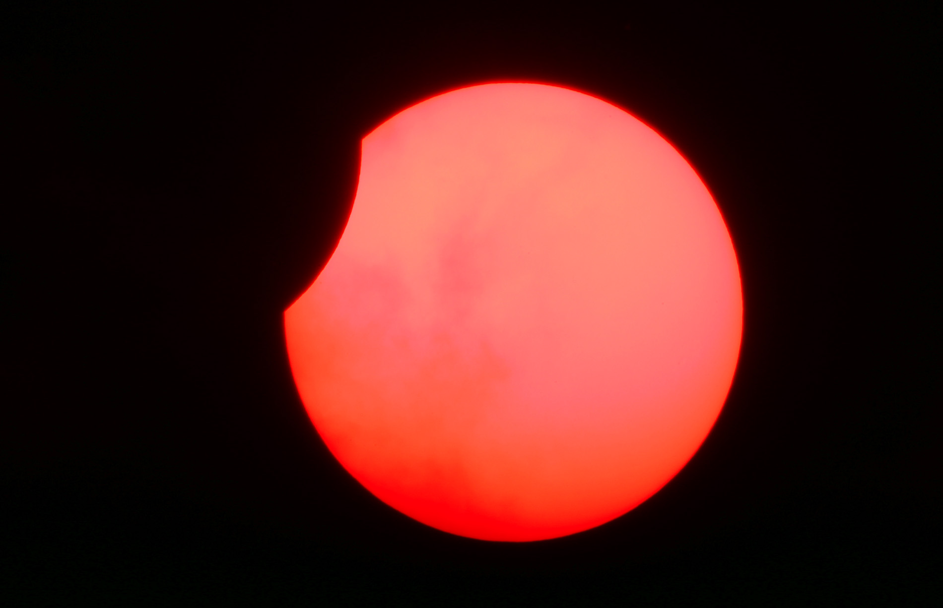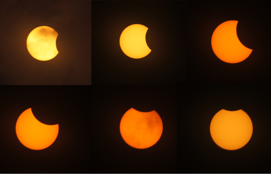 Удалось выхватить пару кадров окончания затмения. Один практически сквозь облака, второй через дымку, когда облачность уже начала рассеиваться.