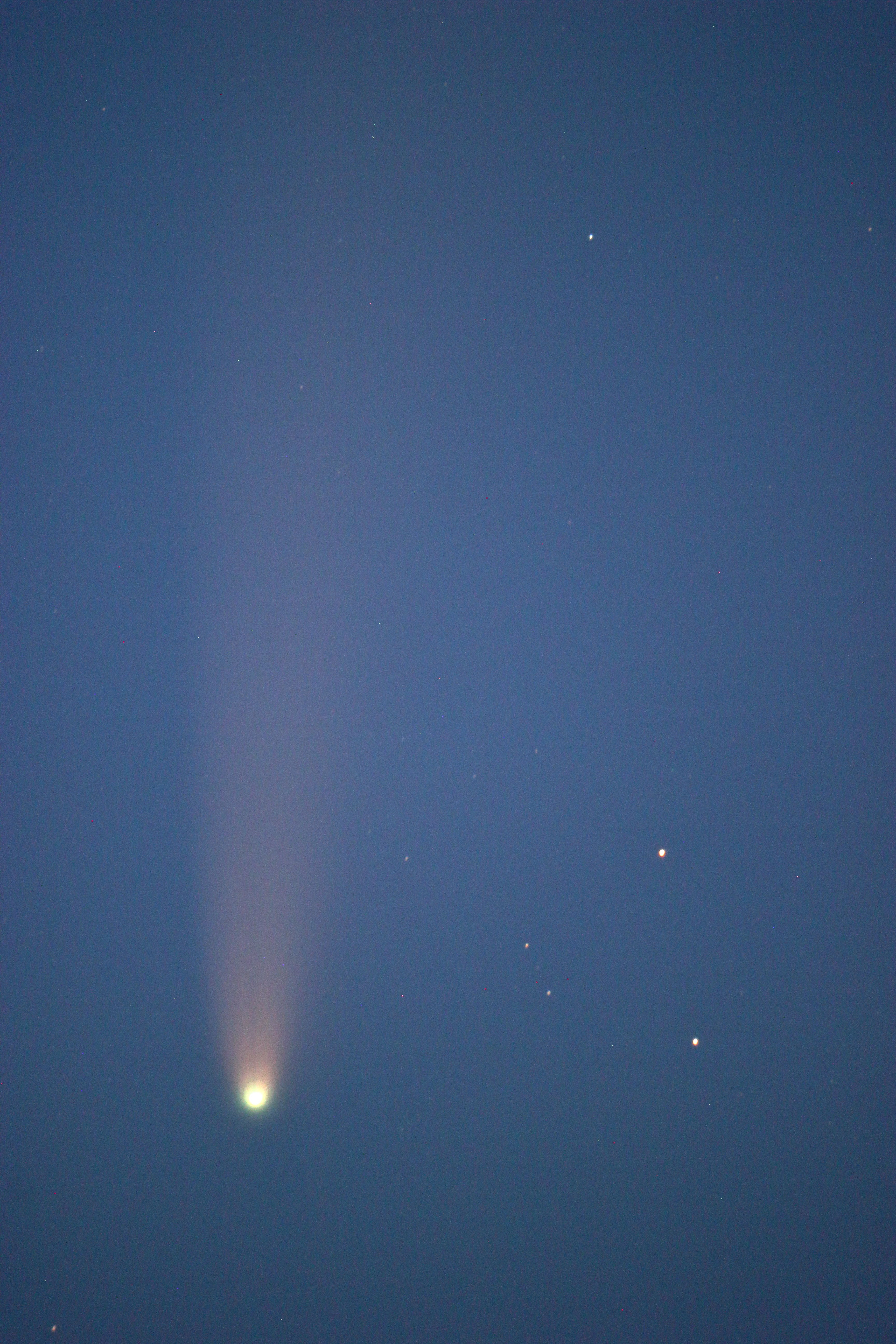 Комету заметил в полночь. Искал и наблюдал через бинокль 5х25. Оказалось, что двумя глазами приятней наблюдать и боковым зрением гораздо более длинный хвост заметен, чем в Ньютон. Зато в телескоп можно увидеть подробности, как от ядра отходят два хвоста и тень между ними. Хорошие условия были для neowise с 00:40 до 01:45, а далее пошли серебристые облака, которые мешали наблюдать длинный хвост в 02:00.