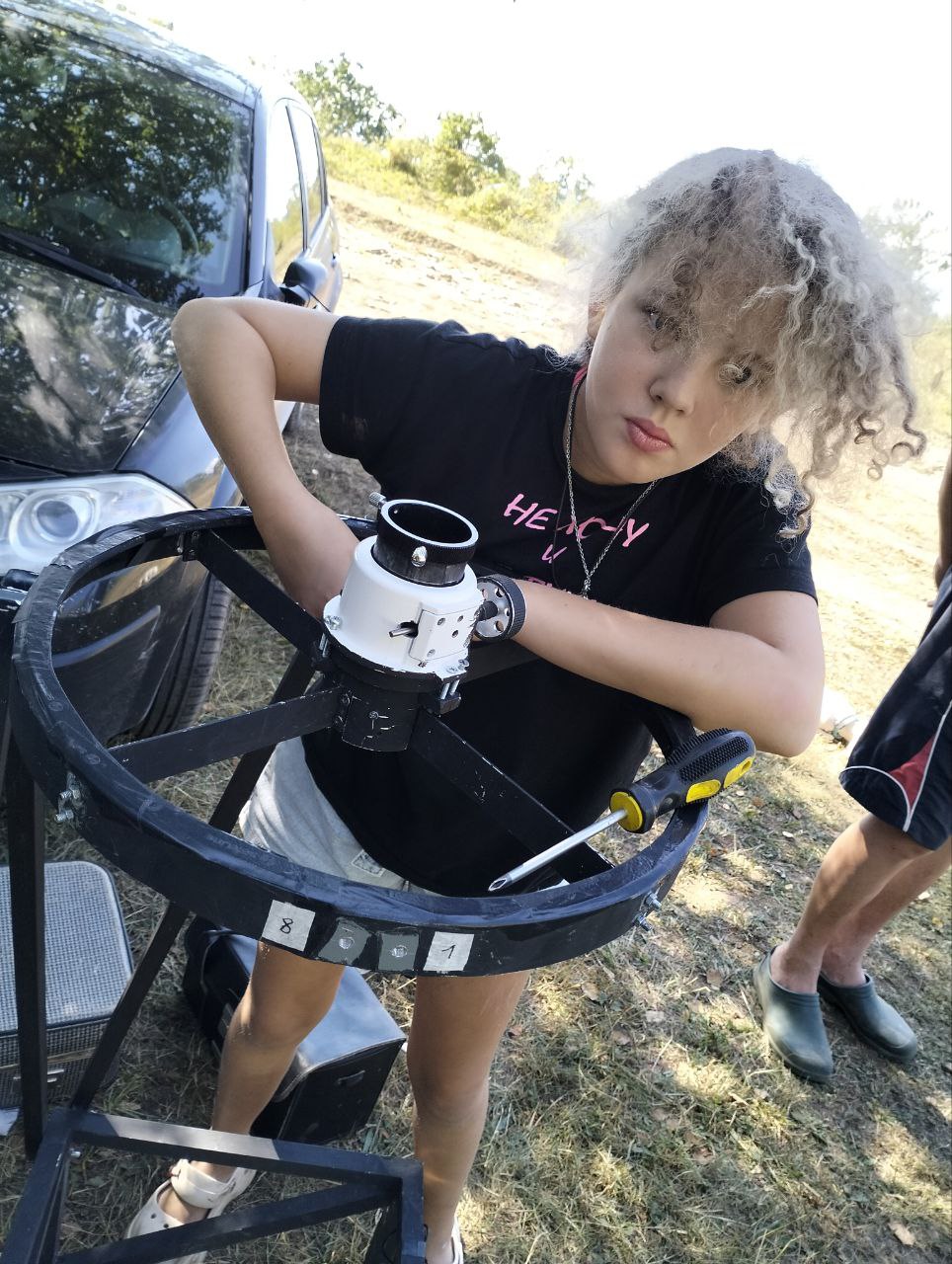 Лиза помогает собрать телескоп.