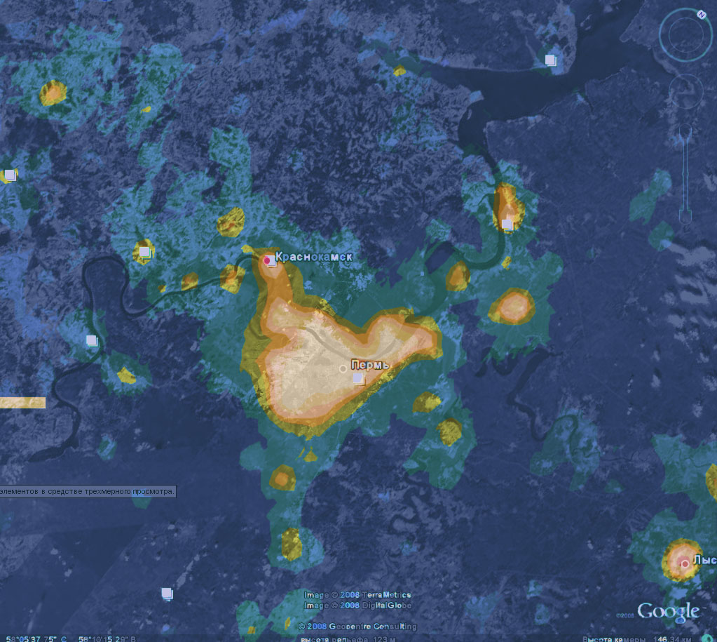 вот, сложил в фотошопе две гугловские карты для понимания засветки