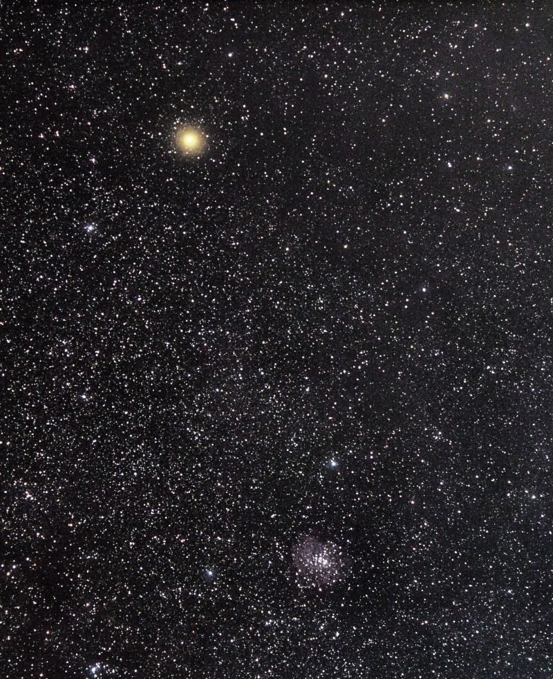 Снял позавчера комету Виртанена, я удалением хроматизма обьектива перестарался и чересчур обесцветились звезды с фотошопом пока на вы, сумма 9 по 30 сек,кэнон 550d фокус 55мм, испробовал выдержку забавное число получилось случайно 222 секунды