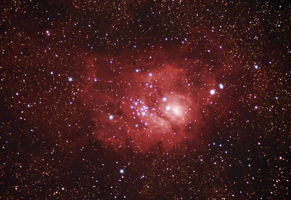Я в Болгарии тестирую свою амбарку (монтировку №11). Вот предварительная обработка М8. 13 кадров по 117 сек ISO800. Canon 350Da, телескоп Deep Sky 70\400. Снимал без гидирования.