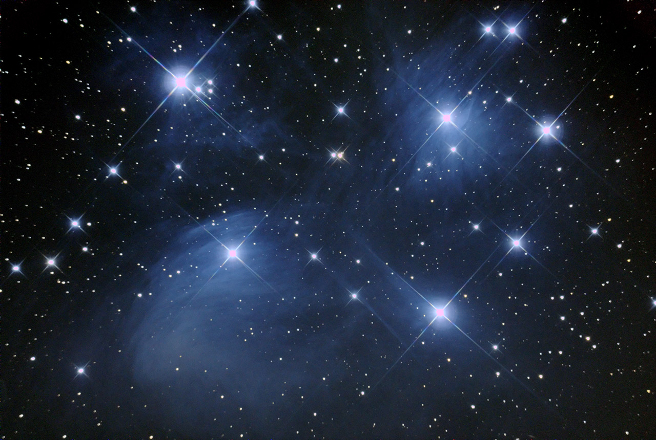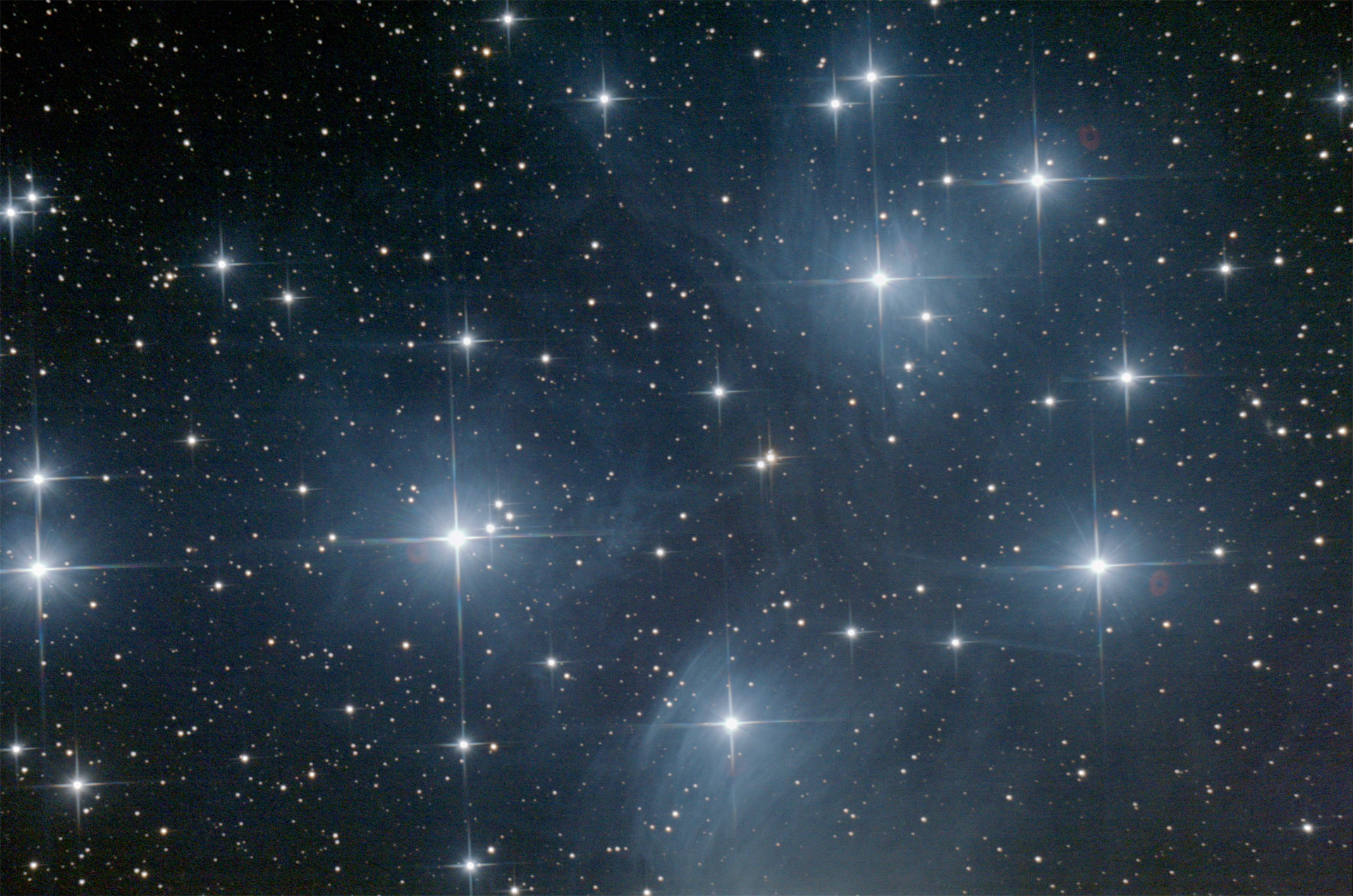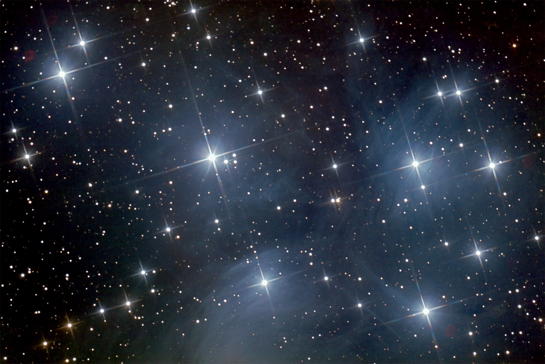 Получился не идеал, снимал без корректора, плюс звезды из за огрехов гидирования получились надкусанные, а главное эти плеяды в кадр не лезут. Я как то пробовал мозайкой по ним дать, но фон разный получается. А с правкой фона у меня проблемы, не могу освоить выравнивание.