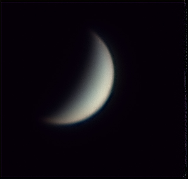 Венера от 07.02.25. Снимал сквозь высотную перистую облачность уже на заходе. Погоды нет, серп Венеры все уже, поэтому хотя бы так, или вообще никак. Также пытался снимать в ультрафиолете, что бы вытянуть облачность, результат отрицательный. Слишком низко над горизонтом.