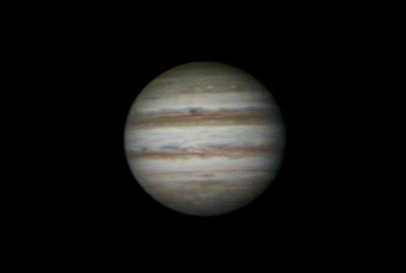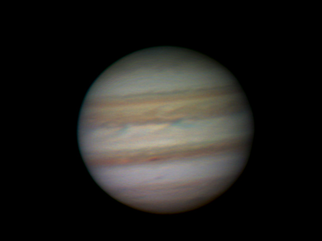 Обработка в RegiStax 5, AutoStakkert не справился с выравниванием из за сильной турбуленции. Итоговый результат ниже среднего, так, чисто отметится. Видно возрождение ЮЭП, так что через энное время мы опять будем видеть Юпитер с двумя облачными полосами.