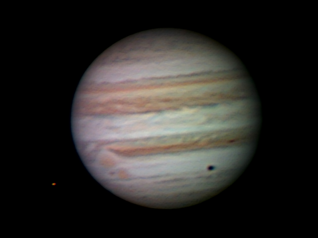 Точка внизу это тень от спутника Юпитера - Европы, она видна в левой части кадра. Из за разных скоростей планеты и спутника она размазалась при обработке.