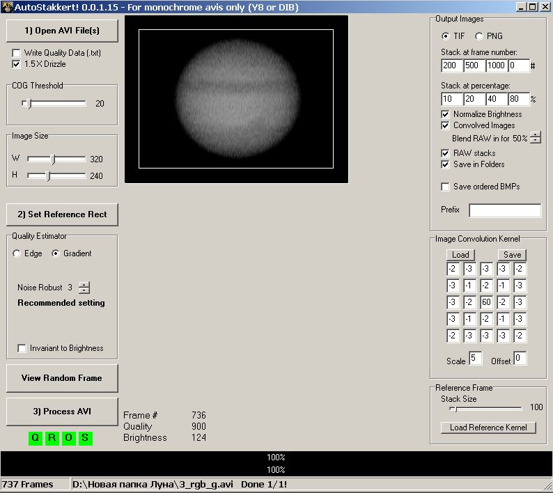 AutoStakkert работает только с AVI, причем с черно белыми роликами. Поэтому материал предварительно надо разбить на R-G-B, к примеру с помощью AviRaw, а затем полученный результат поканально сложить в шопе. Мороки много, но оно этого стоит. Я конечно не такой знаток, но тем не менее ни в RegiStax ни в AviStack я таких результатов получить не мог