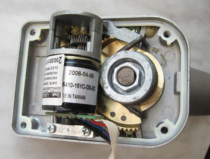 Монтировку №9 сделал из мотоподвеса для спутниковой антенны. Мне достался дешёвый экземпляр, в нём используется сектор червячного колеса, размером примерно четверть окружности. Сделан он из пластмассы. Число зубьев всего колеса – около 100. Червяк – стальной, стоит в шарикоподшипниках. А вот ось колеса установлена в подшипники скольжения диаметром 40 мм. :( Попросту железная труба, диаметром 40 мм вставлена в пластмассовые втулки. Смазана, правда, хорошо. Червяк прижимается к зубьям колеса при помощи ролика, бегущего по желобку, сделанному на внутренней поверхности обода колеса. Насколько я понимаю, ролик должен был вращаться, но мой ролик был намертво заклинен, я его убрал. Серводвигатель соединён с червяком через редуктор. Поскольку я работать с серводвигателями не умею, пришлось заменить его на шаговый. Он оказался странным: в одну сторону крутил нормально, а в другую – дёргался, стучал и тяги не было, хотя, крутился с той же скоростью. Ладно, можно обойтись и без заднего хода, но пришлось сделать крепление червяка, позволяющее расцеплять червяк с колесом. По сути, мотоподвес – это экваториальная монтировка, поэтому переделок было мало: