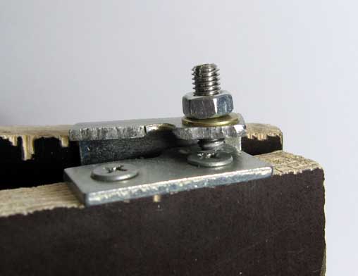 Сделаны они так: на торцы подвижной доски прикрутил железные пластинки с просверленными в них дырками диаметром 2 мм. На неподвижную доску поставил уголки, в которых сделал отверстия с резьбой М5. В эти отверстия вкрутил винты с заострёнными концами. Концы винтов входят в отверстия пластин и используются как подшипники скольжения.
