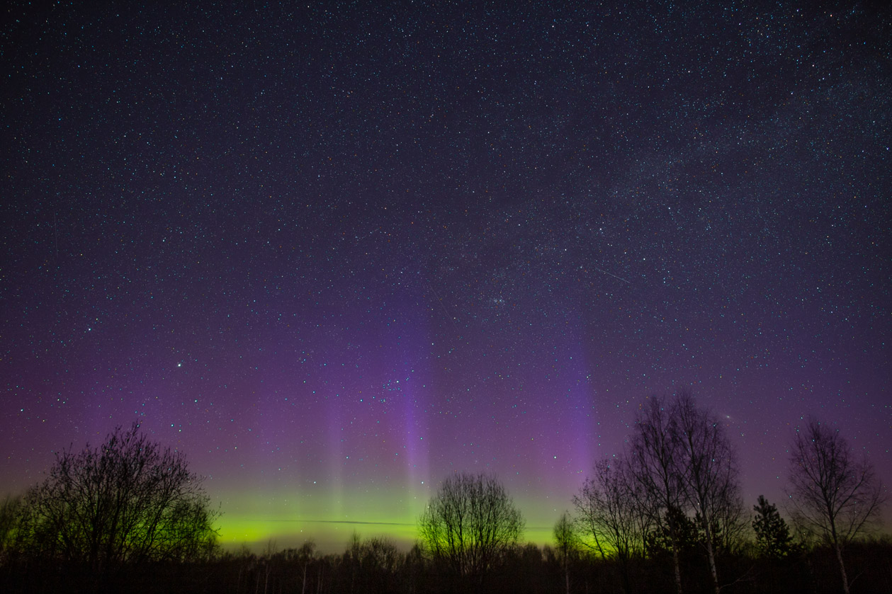 Вчерашнее полярное сияние, разгорелось в третьем часу ночи. В начале появились 2 ярких столба, которые затем растянулись на менее яркую вереницу, первый раз удалось наблюдать его визуально. Canon 6D, Samyang 24mm на 2.0 15 сек, ISO 1600.