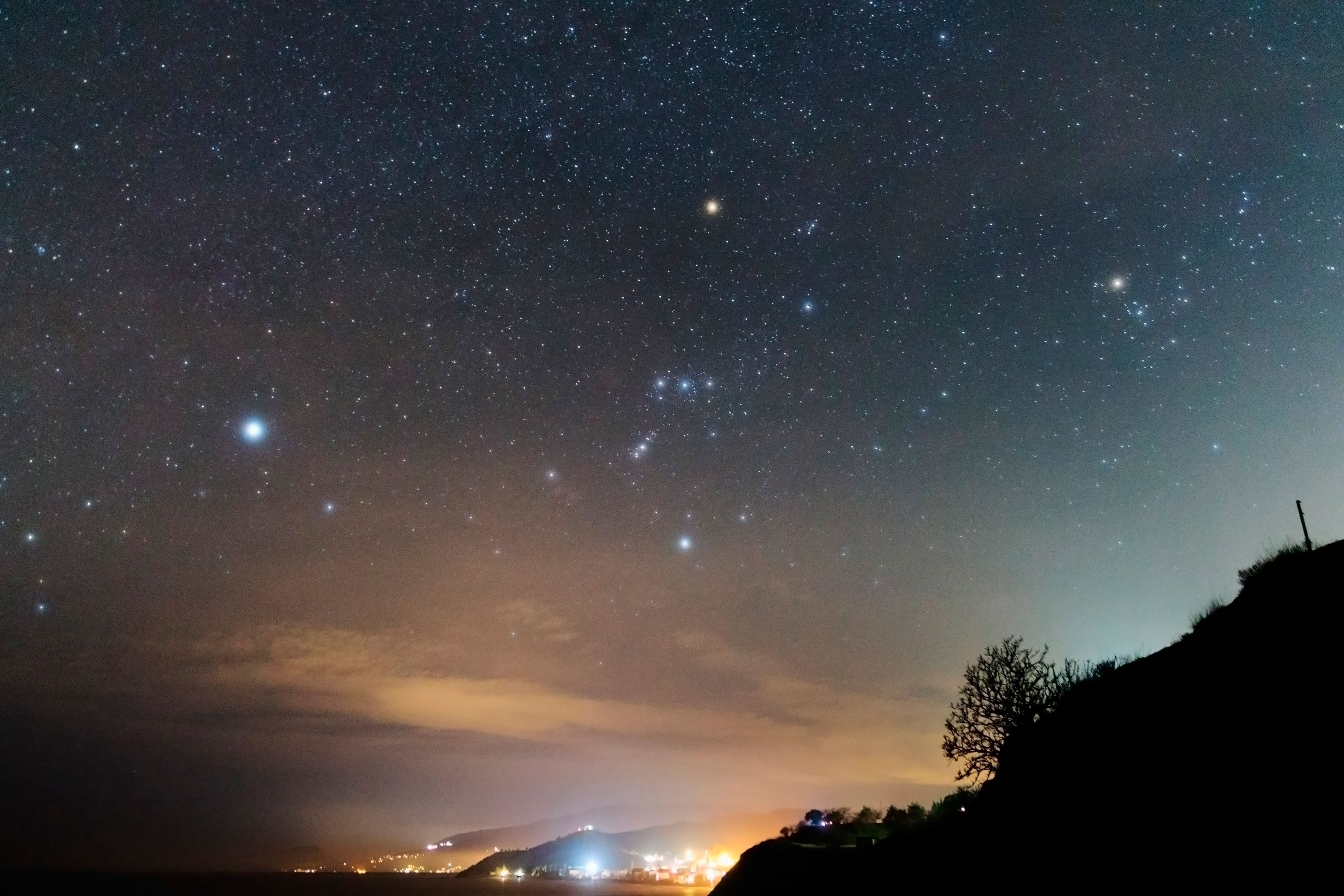 Орион, Большой Пес и часть Тельца над морем. Малореченское. SW Star Adventurer, Canon 1100D, Tamron 17-50 2.8 (17), ISO 1600, 30 сек.