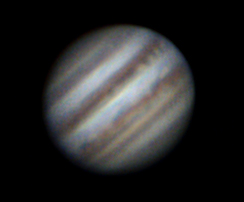 Вчера пробовал снимать Юпитер с ньютоном 150/750, при использовании двух барлоу SW 2х получается мыло, видимо нужна все-таки нормальная Барлоу 3-5 PAG от НПЗ. Ниже полученное изображение с одной барлоу 2х, масштаб конечно маленький.