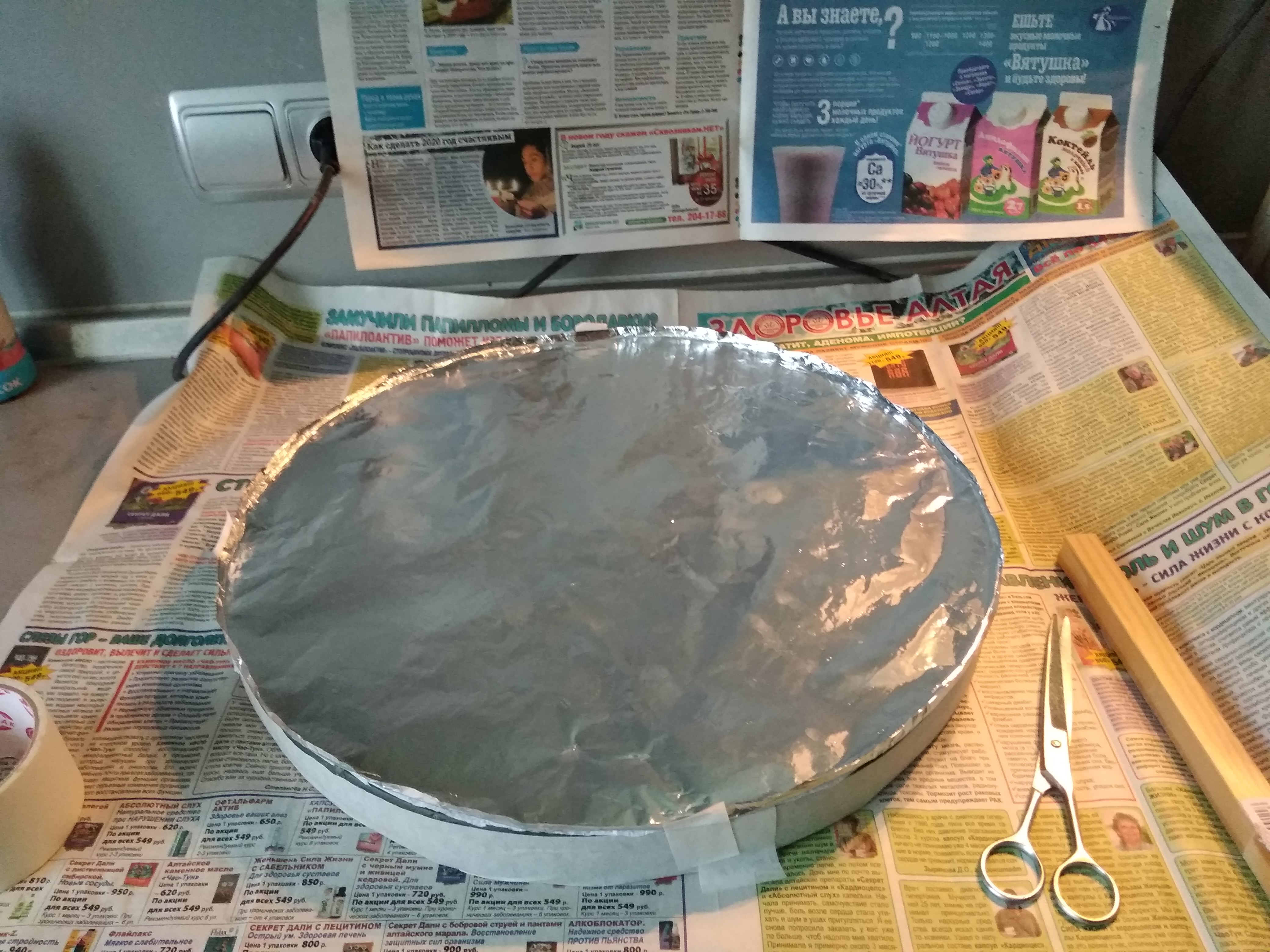 Положил зеркало, сверху салфетку , потом круг из фольги с бортиками.