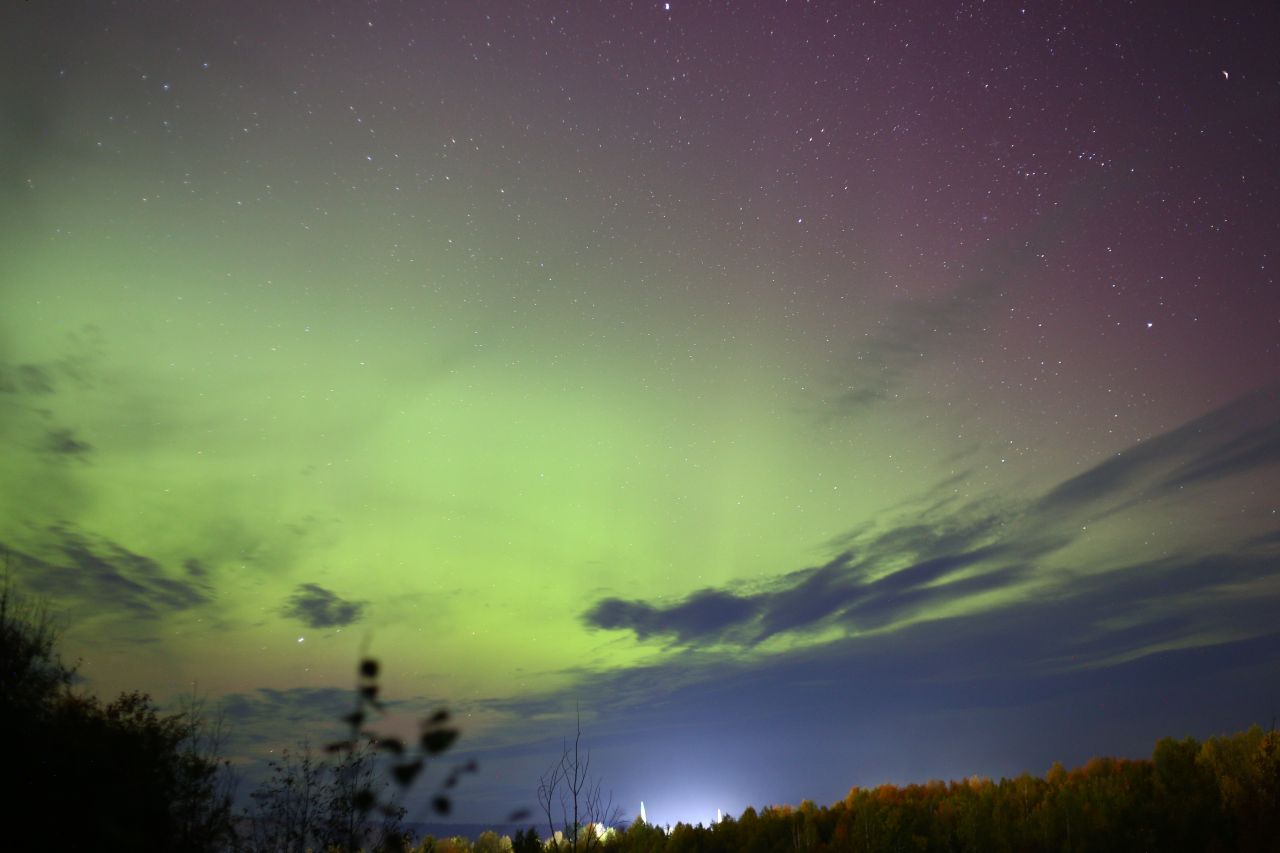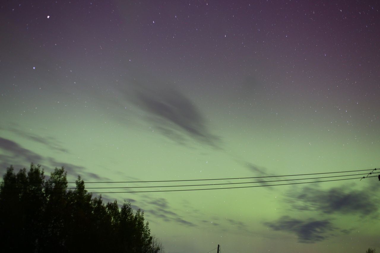 Дали сегодня ночью полярное сияние. Самое интересное отснять не получилось, все затянуло облачностью, успел сделать пару-тройку снимков. Свечение было на весь северный сегмент неба с отличной яркостью.