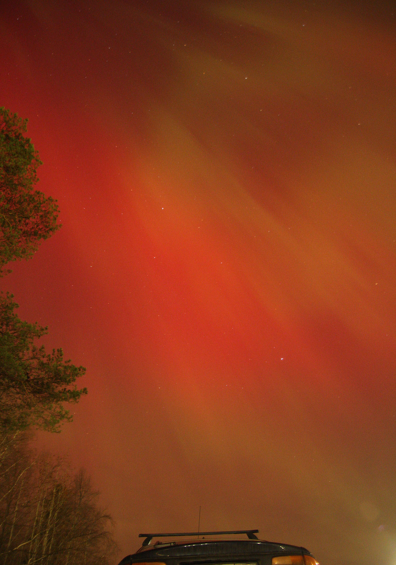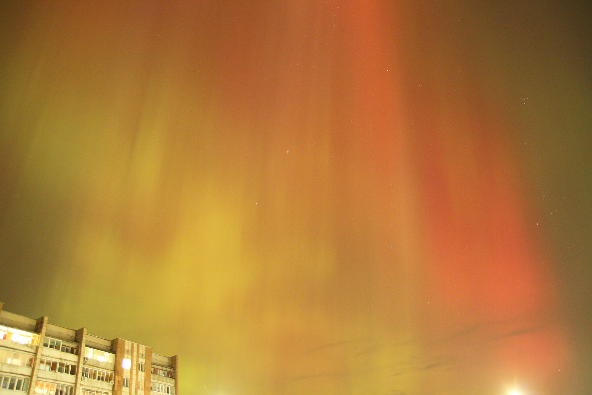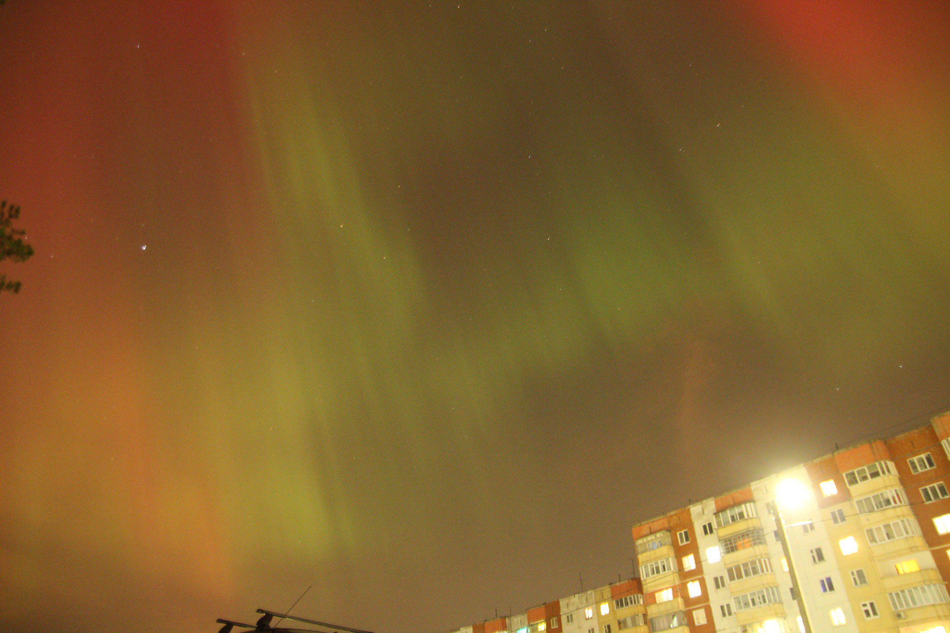 Сегодня была красивая волна от полярного сияния. Яркость великолепная, яркие насыщенные цвета хорошо видимые в визуале. Красный вообще был шикарным, такого я еще не видел.
