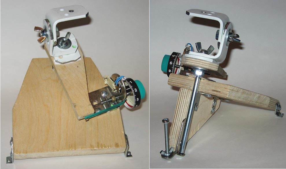 Полярную ось сделал из мебельного болта М8х140. Нижний конец оси заточен под углом примерно 45 градусов и опирается на отверстие в металлическом уголке. Хорошо бы заточить ось на токарном станке, но я заточил на наждаке и притёр к отверстию. Верхний конец оси лежит на металлической пластинке, вырезанной уголком. Жестяная пластинка с дыркой не даёт оси выпасть. На ось накручены последовательно: гайка, шайба, поводок из фанеры, гайка из пластины, самодельная штативная головка, сделанная из двух уголков. Использовались, также, кольцевые прокладки из тонкого картона для увеличения рычага трения.