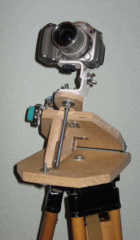 Для испытаний я использовал фотоаппарат Canon S2 IS с 1,5х конвертером. Монтировка была установлена на фанерный столик, укреплённый на треноге от теодолита.