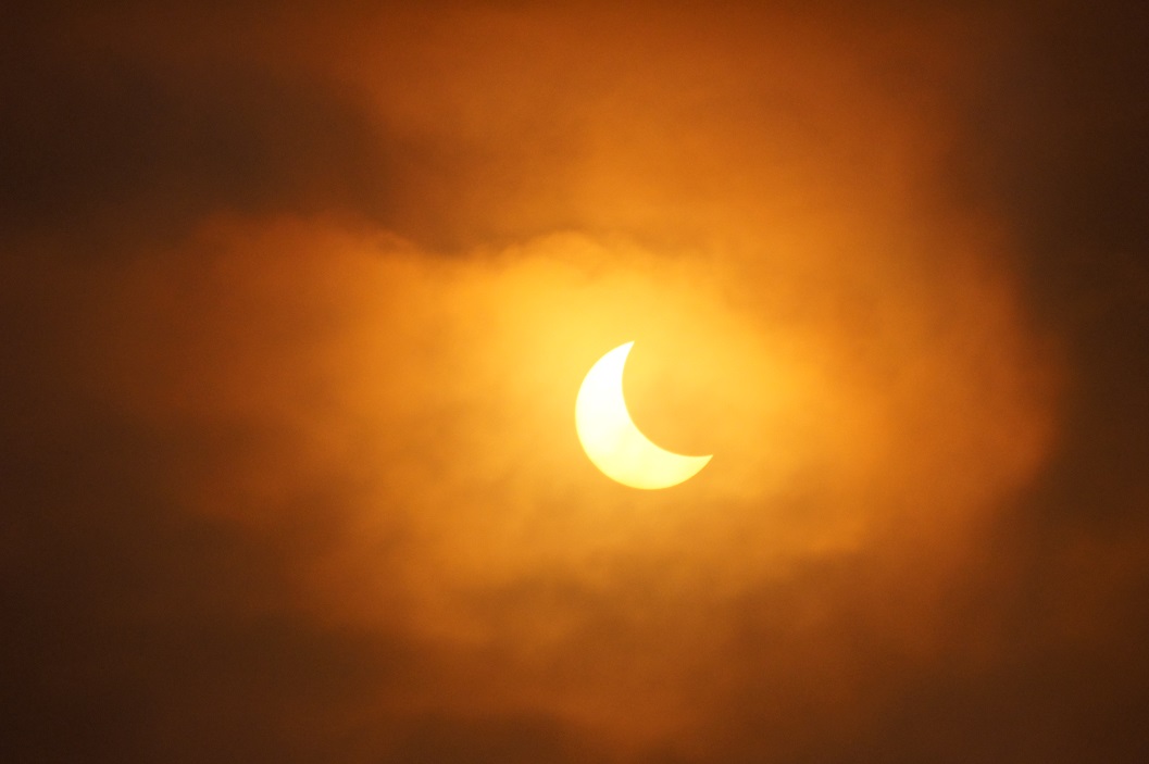 Я собирался уже уходить. Бинокль и фильтры упаковал в сумочку. Развернулся уходить, но чуть ярче стало. Решил вновь бинокль достать и направить на облачное небо, в туманном разрыве показалось НЕЧТО!