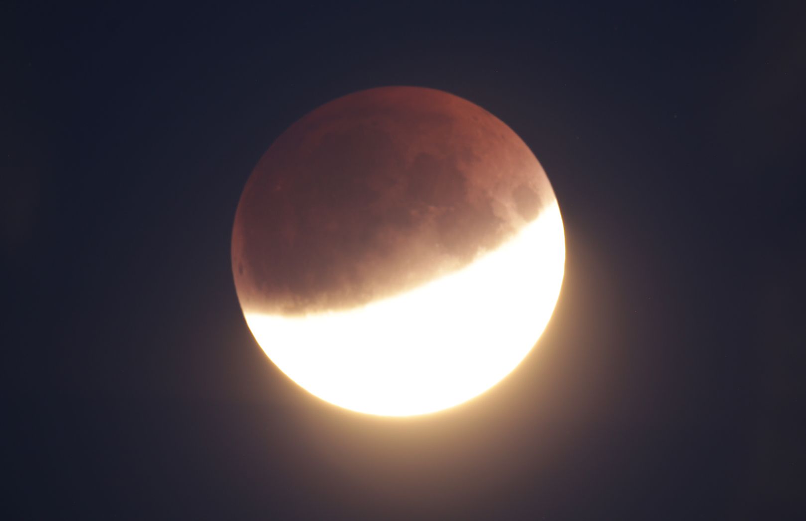 Максимальная фаза затмения которую удалось наблюдать, далее все как обычно затянуло облаками. В верхней части виден характерный красноватый оттенок земной тени.