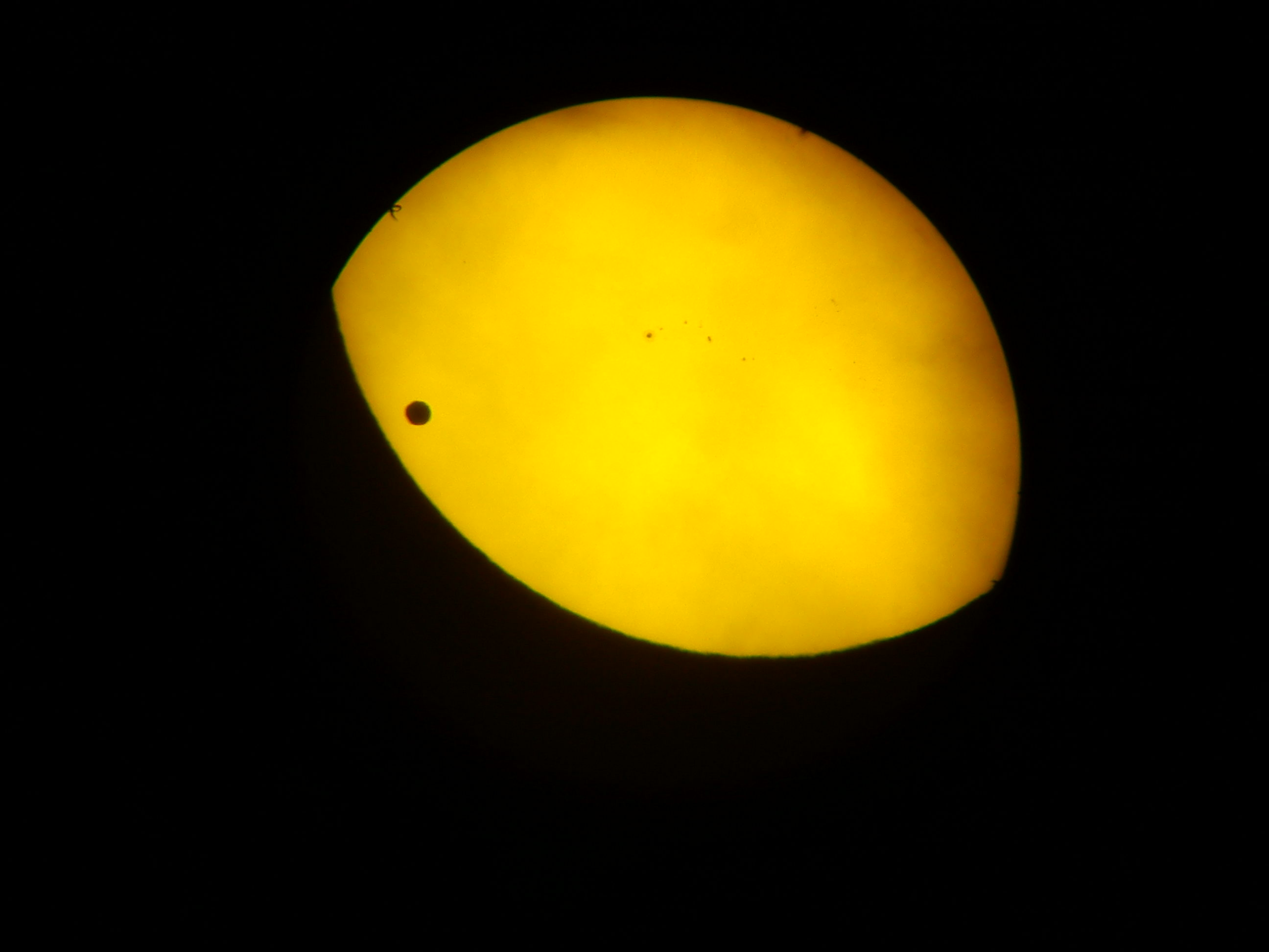 8-го июня 2004 года я снимал Венеру мыльницей Canon A70 через телескоп МТО-1000. Для фильтра использовал плёнку Astrosolar. Было облачно, поэтому на улицу выходить не стал, снимал с подоконника. Думал ничего не получится.