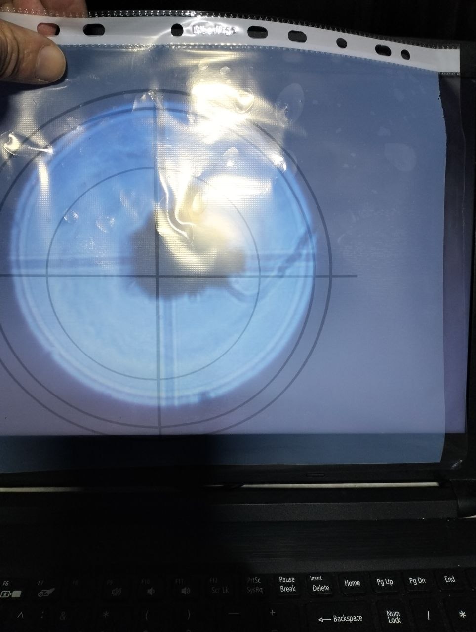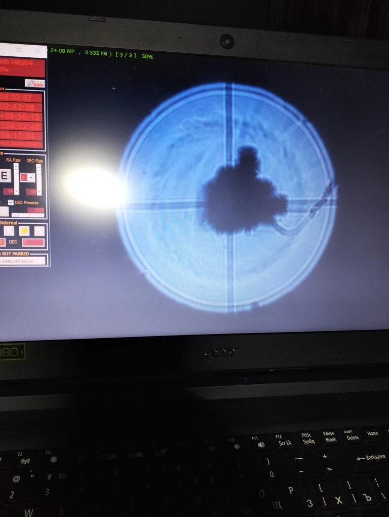 Я попробовал юстировать телескоп с помощью маски/мишени. Распечатал на прозрачной пленке мишень с перекрестием, загнал звезду в дифокус, сфотографировал ее, приложил к изображанию мишень, смасштабировал изображение, чтобы совместить круги . И сразу видно где несовпадают растяжки с перекрестием и куда и двигать зеркало.