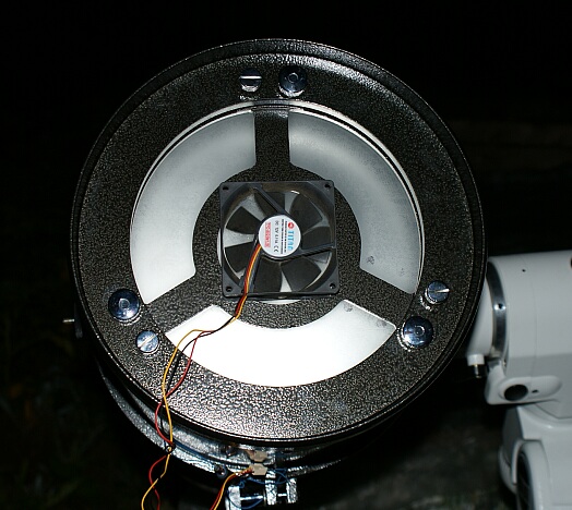 Я кстати сделал все таки обдув ГЗ (кулер дует от зеркала), отчасти для ускорения термостабилизации. К тому же сзади все равно крышки не было и в оправе наблюдались четыре отверстия с резьбой как раз под 80мм кулер :smile: Поэтому я не мог устоять перед соблазном туда его поставить :smile: Из опыта использования скажу, даже если ГЗ запотело включение кулера сгоняет появившийся конденсат примерно за 30мин, ну там плюс - минус, зависит от условий окружающей среды.