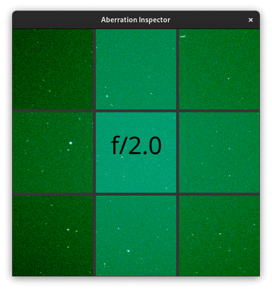 Главным образом, я хотел проверить, есть ли тилт. Для этого я измерил полуширину (FWHM) изображений звёзд по всему кадру в зависимости от положения фокусировочной звезды в кадре (слева, центр, справа). Если у объектива тилт, то ожидается, что наилучший FWHM звёзд был бы в той же области кадра, где находится фокусировочная звезда. Опыт показал, что дело обстоит не так. Слева звёзды остаются хуже звёзд справа независимо от положения фокусировочной звезды, см. анимацию: Таким образом в объективе не тилт, или, по крайней мере, тилт дает не главный вклад в аберрации.