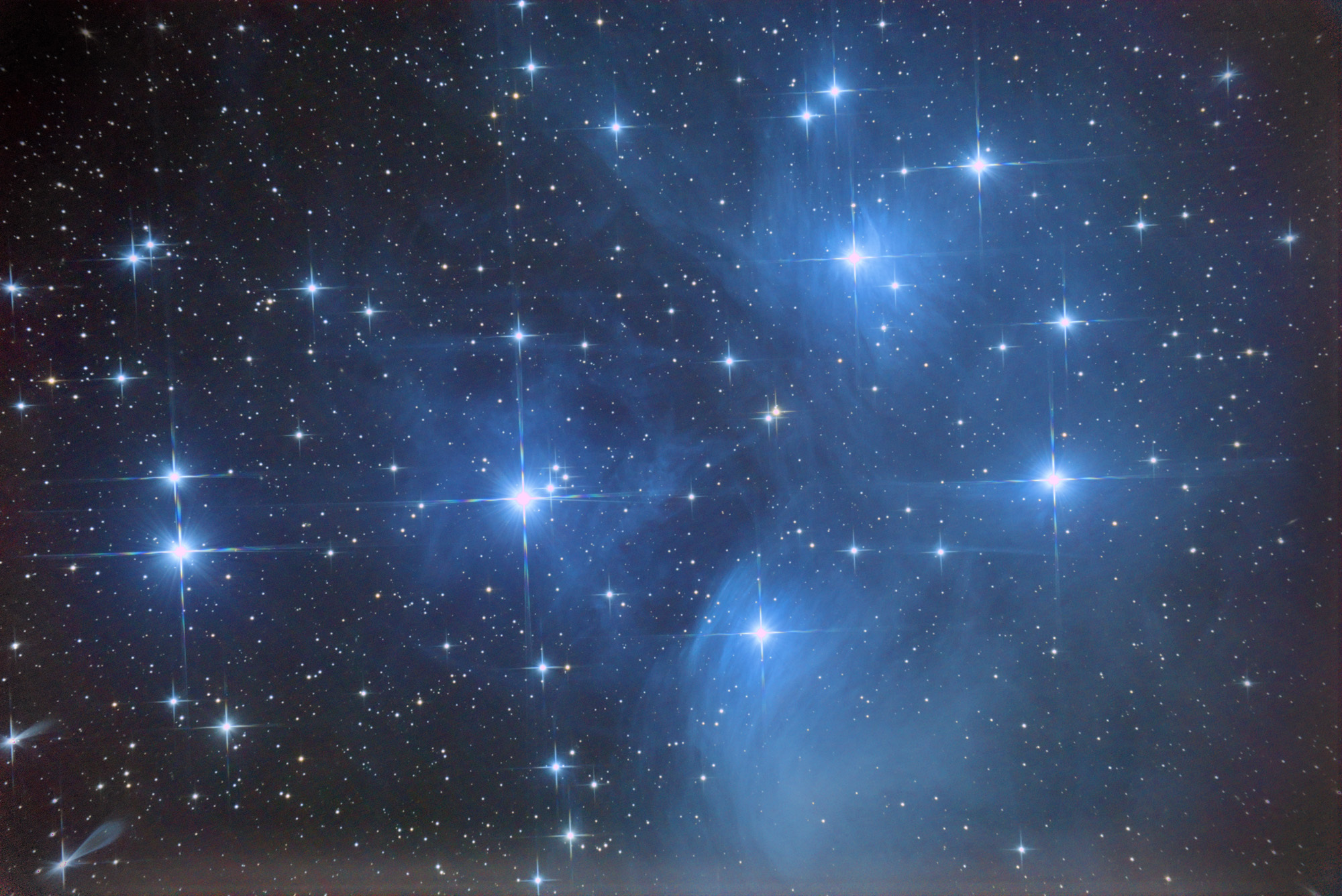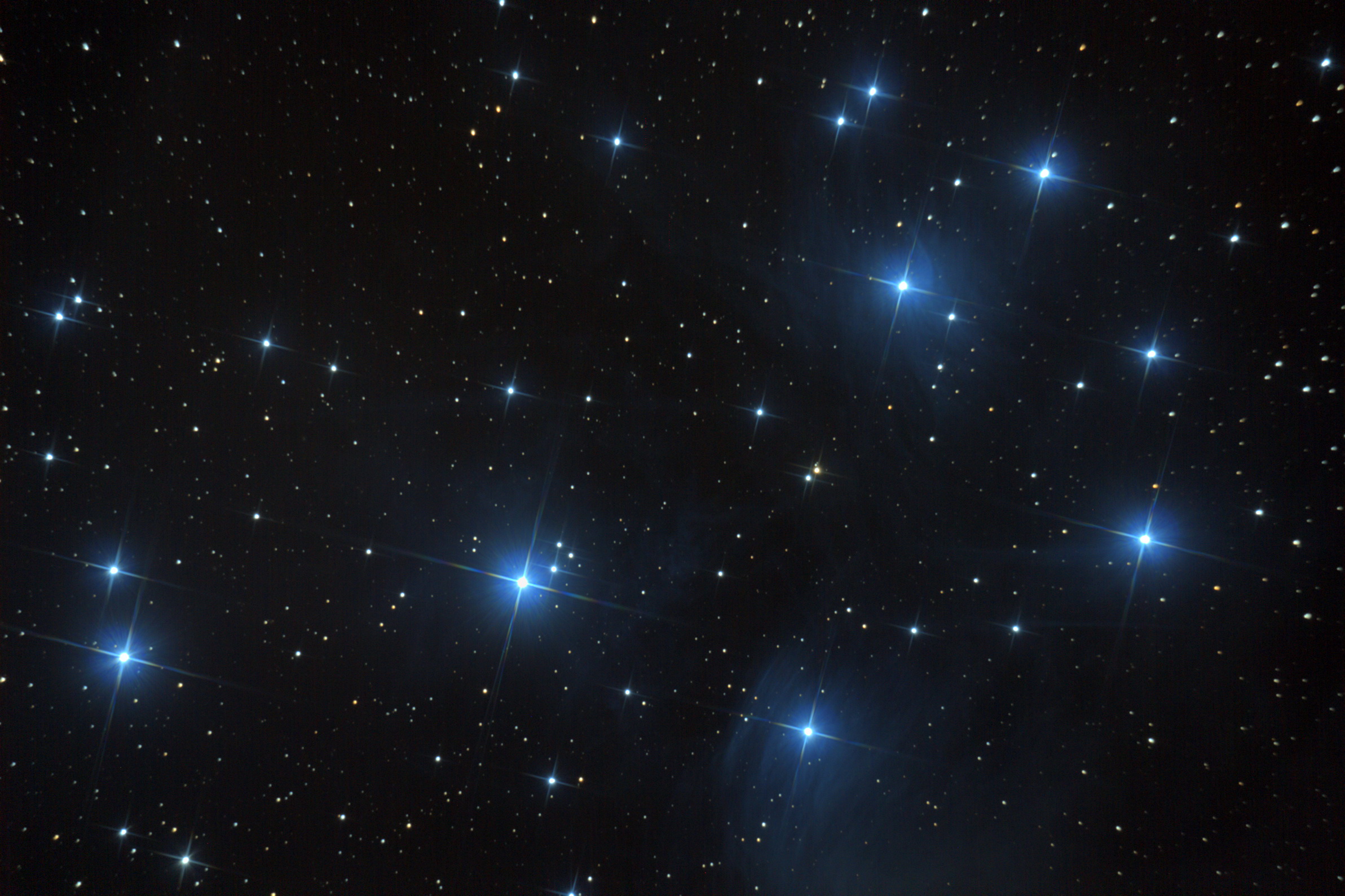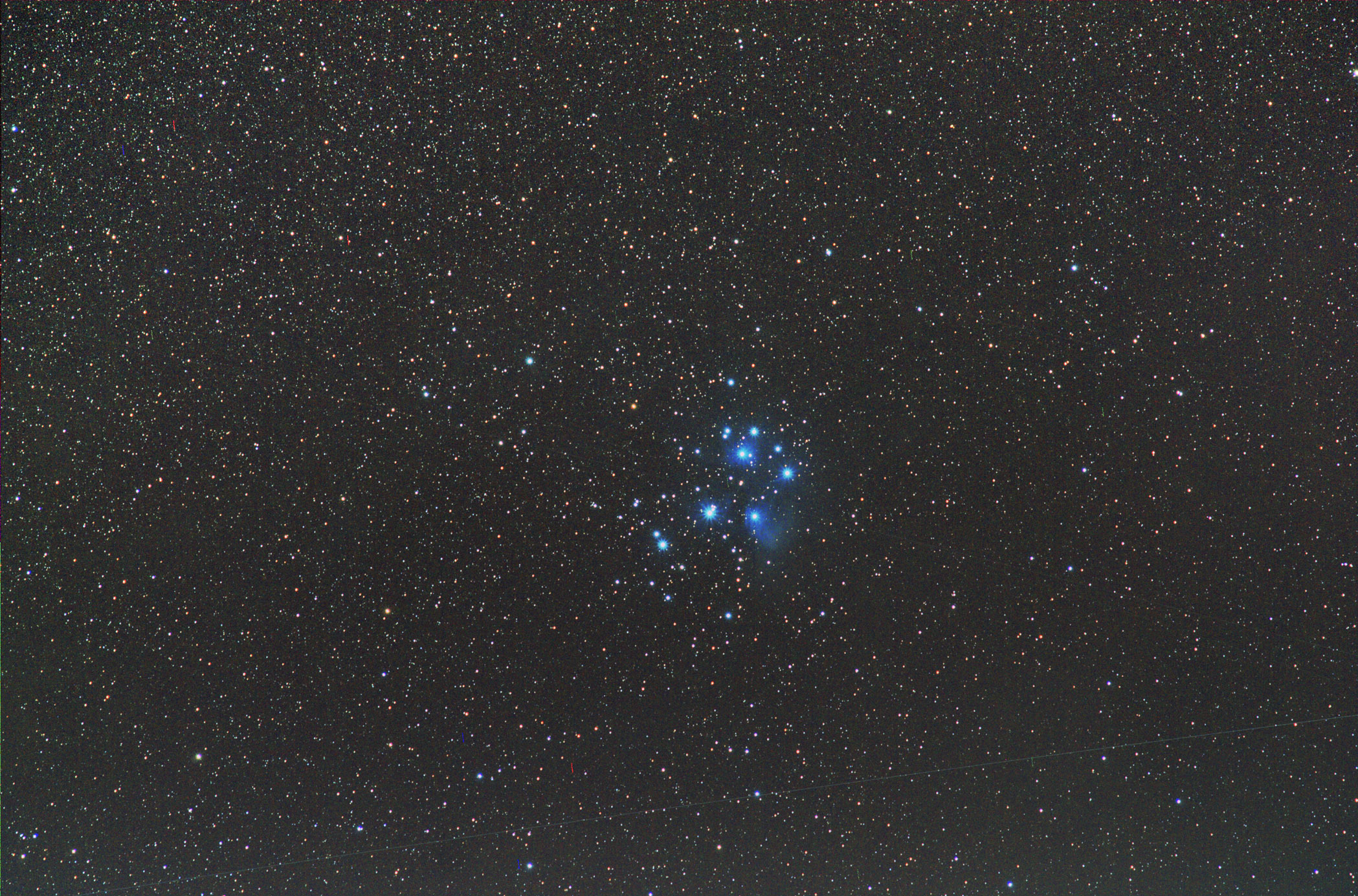 Практически технический кадр, тестировал новый фотик. Снято 25.11.14 на SW25012EQ6pro + паракорр+ Canon 6D, обработка в IRIS. 21 кадр по 4 мин, ISO 3200. Шумы давить специально не стал. Межкадровых подвижек не было и за счет этого на фоне появился характерный рисунок "подметания метлой", полосы по диагонали особенно заметные на шумах. Фотоаппарат тяжелый, начал прогибаться фокусер, движение было в одну сторону и за счет этого шумы образовали этот рисунок.