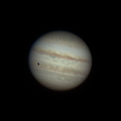Черное пятнышко, тень от спутника Ио, правее можно различить сам спутник в виде светлой точки.