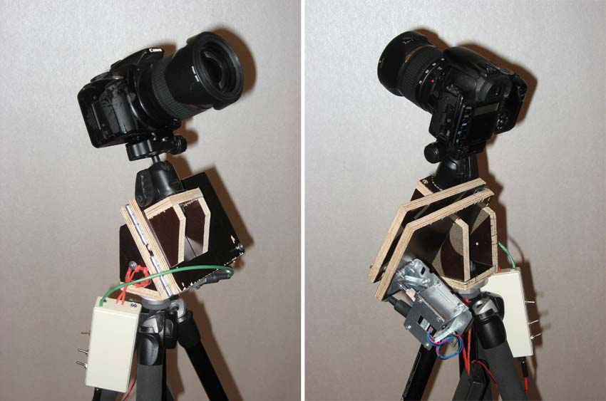 К сожалению, подходящая для съёмок погода на нашей 58-й широте бывает очень редко, поэтому тщательно тестировать монтировки не получается, но в середине декабря неожиданно подвернулась двухдневная поездка в Болгарию. Не было смысла брать с собой тяжёлое оборудование, но не ехать же с пустыми руками. Старыми монтировками пользоваться не интересно, поэтому специально для поездки сделал классическую амбарку (№11). Вообще-то такие амбарки мне не нравятся и я их никогда не делал, так как от схемы астротракера можно добиться большей точности, но народ упорно делает именно классические амбарки, поэтому и я решил попробовать. Понятно, что для получения хорошей точности, амбарка должна иметь большие размеры, но я сделал маленькую амбарку с длинной рычага 137 мм. Делать новый электропривод не было времени, поэтому использовал старый - №4. Доски из двенадцатимиллиметровой фанеры имеют размер 120х150 мм. Они соединены обычными мебельными петлями. (Петли я подобрал по минимуму люфта.) Винт М3 электропривода через иголку толкает подвижную доску. К одной доске приделана площадка для фото штатива, к другой – площадка для штативной головки. Конструкция предельно простая. Вес монтировки 800 граммов, из них 300 граммов – электропривод. Если обрезать лишнюю фанеру и взять лёгкий двигатель, то вес можно уменьшить. Плюс штативная головка 230 г., пульт с батареей – 200 г., штатив 1170 г. Таким образом, для астросъёмки кроме фотоаппарата, пришлось взять дополнительно 2,4 кГ оборудования. Я использовал Canon 350Da и объективы Юпитер-37А и Tamron 28-75/2,8.