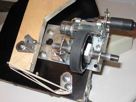 Я экспериментирую с электроприводами. Попробовал фрикционный привод, для которого использовал двигатель от дисковода. Из двигателя выходит длинная ось, которая своим концом опирается на штатный подшипник. Я взял обрезиненный валик от принтера, насадил его на винт и прижал к нему ось двигателя пружинящей стойкой. Как я и предполагал, настроить такую конструкцию довольно сложно. Тем более, что винт у меня получился кривой, т.к. я сам его нарезал, чтобы получить мелкий шаг.