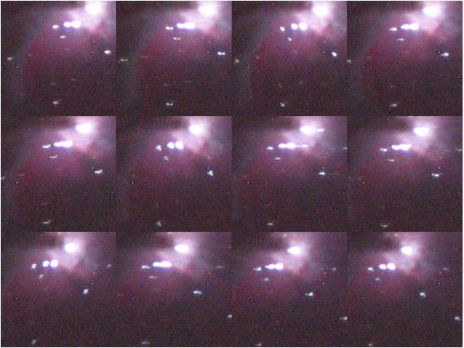 Здесь приведёны кропы двенадцати 64-хсекундных кадров. Изображение от кадра к кадру смещается влево и вниз. Это говорит о том, что моя монтировка забегает на 1 секунду в минуту и что полярная ось выставлена неточно. При установке полярной оси треки звёзд были неровными, т.е. фотоаппарат качался от ветра. Возможно, это связано с тем, что тренога стояла на рыхлой земле. Но основной смаз дали неточность механики и дрожание руки. После сложения шести из двенадцати минутных кадров получился такой снимок.