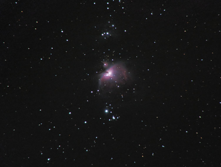 Для испытаний поставил на монтировку телескоп DeepSky 90/700 и фотоаппарат Canon 600D. В качестве гида использовал Юпитер 21М и камеру QHY5. Без гида тестировать не стал, сразу включил гид. Снимал М42. Из 32-х двухминутных снимков по смазу забраковал только один, правда, ещё 6 кадров забраковал из-за северного сияния. Снимал на даче, в 15 километрах от города. Я остался доволен как монтировкой, так и телескопом. Яркие звёзды, конечно, с ореолами, но это же ахромат… Другие объекты снять не удалось, так как всё небо было залито северным сиянием.