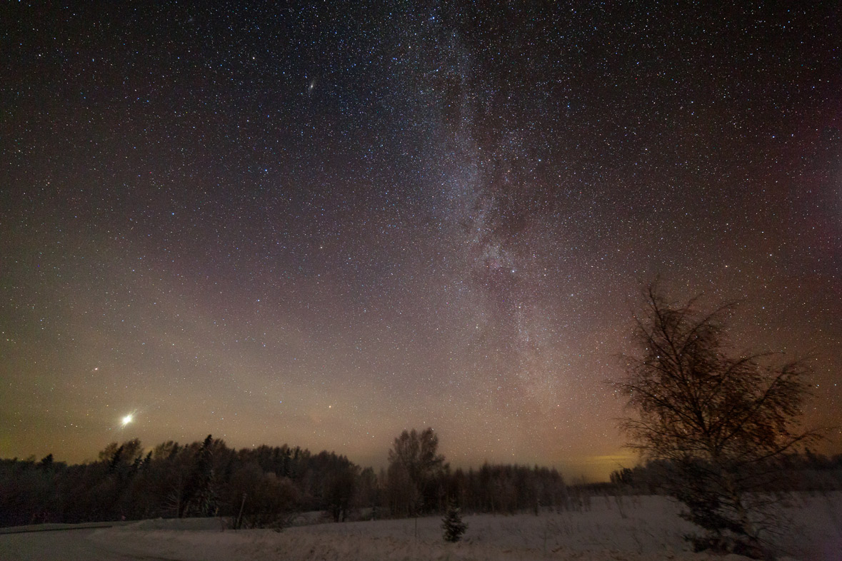 Заход Венеры и Млечный путь вчера в Комарихе. SW Star Adventurer, Canon 5D, Samyang 14 мм 2.8, ISO 1250, 60 сек на зв. скорости, PS. Хорошо также заметны М31 и M33.