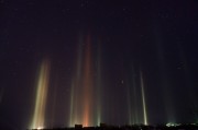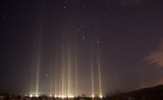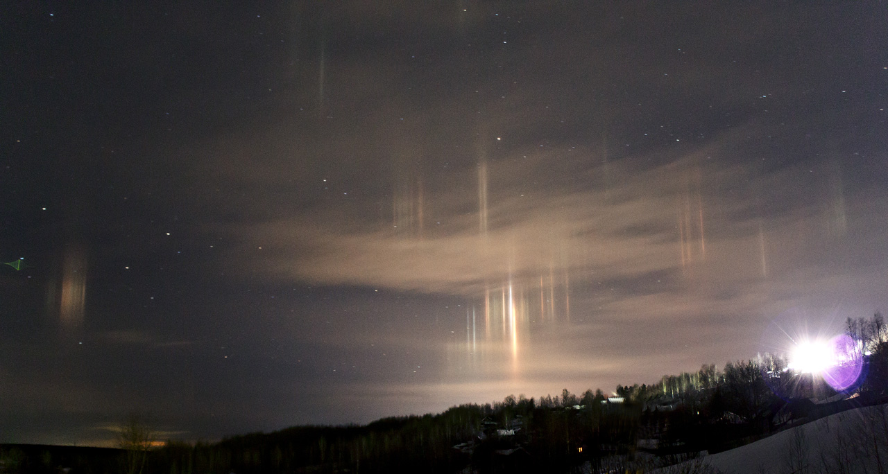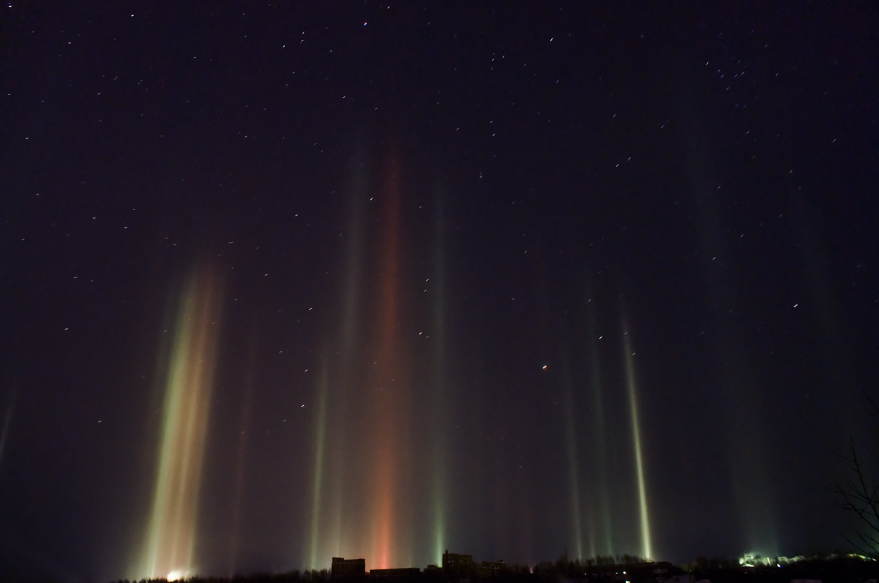 Световые столбы. Явление возникает при низкой температуре ( от –20 С ), отсутствии ветра и наличии большого количества ледяных кристалликов в атмосфере. Ледяные кристаллики в свою очередь, должны быть преимущественно плоской формы (ромбовидные). При падении в воздухе, они будут стараться занять горизонтальную позицию и начнут работать как маленькие зеркала.