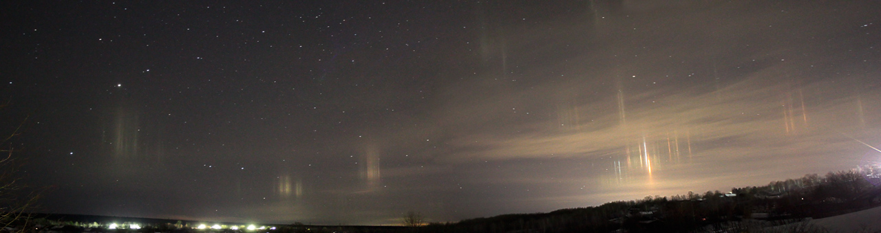 Световые столбы от 03.04.11 Несколько отличаются от классических. Главное отличие в том что они не были привязаны к конкретным источникам света. От ближайших фонарей ничего подобного не наблюдалось, это наглядно можно увидеть на небольшой панораме. Температура на момент явления составляла -4 по цельсию.