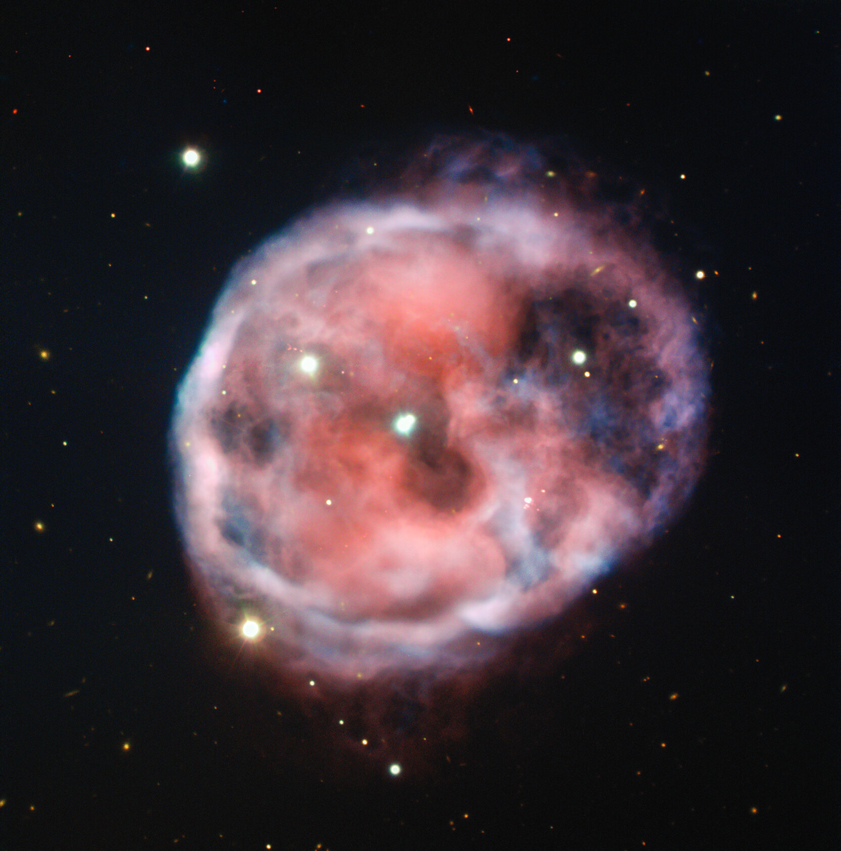 Очертания газовой туманности, остатка давно погибшей звезды, расположенного в «брюхе» созвездия Кита, напоминают плывущий в темном пространстве космоса череп. На Очень Большом телескопе ESO (VLT) получен новый прекрасный цветной снимок Туманности Череп. Это первая известная планетарная туманность вокруг тройной звезды – тесной звездной пары, вокруг которой на большом расстоянии обращается третий компаньон.
