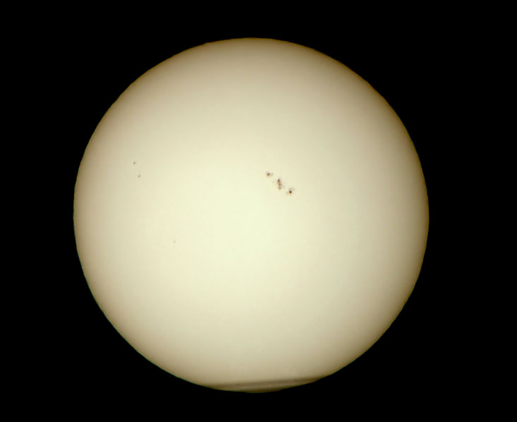 На Солнце образовалась группа пятен. Сфотографировал мыльницей через объектив ЗМ-5А. Снимал с подоконника через стекло. Фильтр из плёнки Astrosolar.