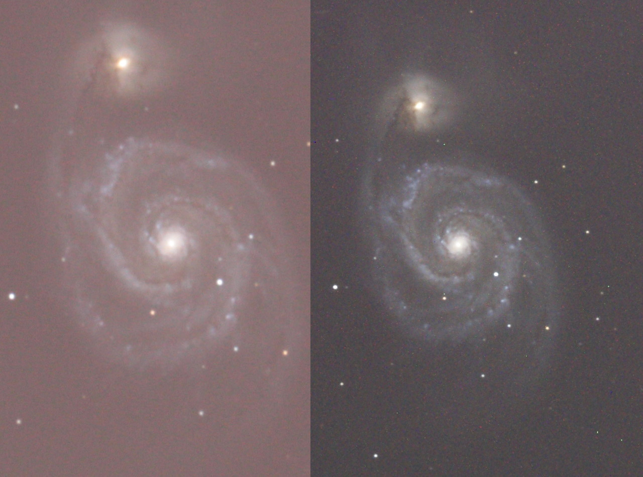 100% кропы без какой либо обработки. Галактика М51, выдержки в обоих случаях 10мин, ISO800. Кэнон слева сонька с права.