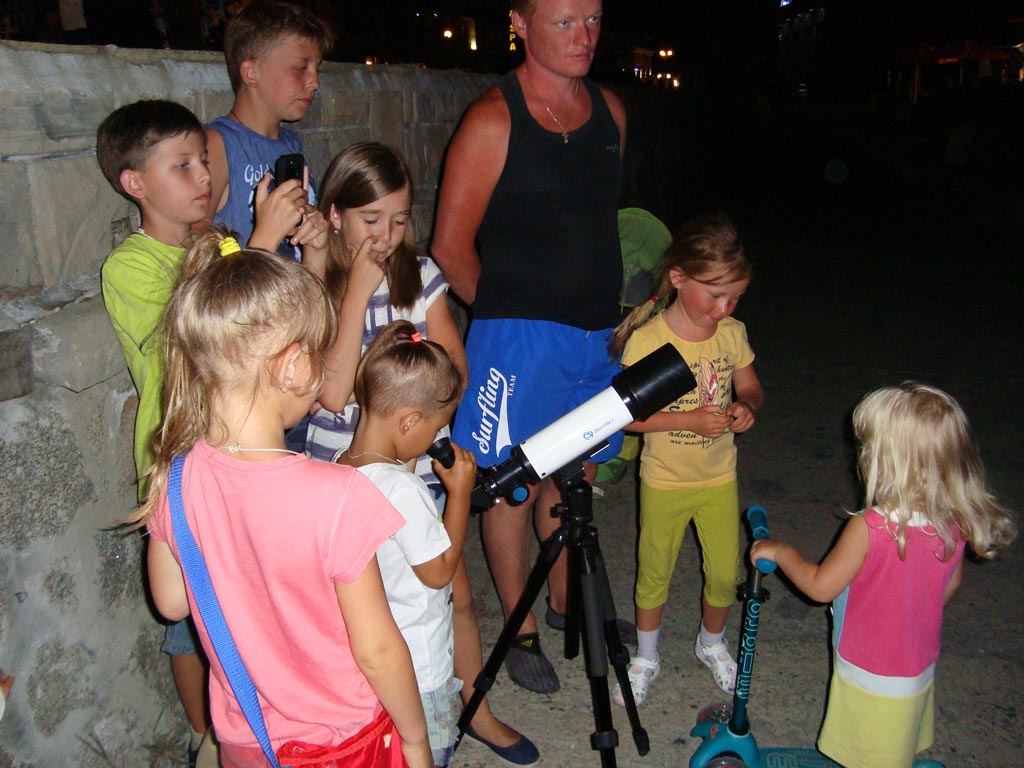 Я вчера решил показать внучкам Луну и планеты, они позвали своих друзей, получилась небольшая тротуарка.