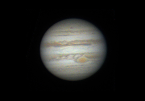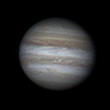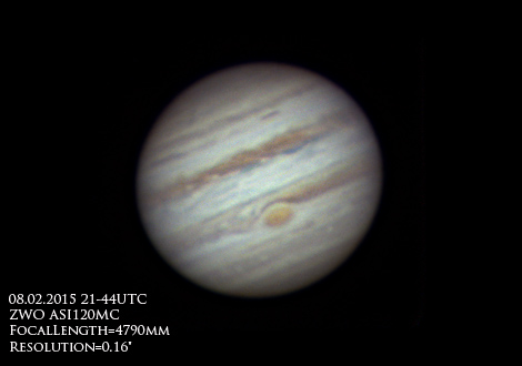 Юпитер от 08.02.15. На небе присутствовала высотная дымка, контраст за счет этого пострадал, но зато удалось вытянуть хоть какие то детали. Когда присутствует такая высотная облачность атмосфера не так турбулит. Связано это ИМХО с высотными струйными течениями. Когда поток затормаживается появляется такая дымка. Меньше скорость потока, стабильней атмосфера.